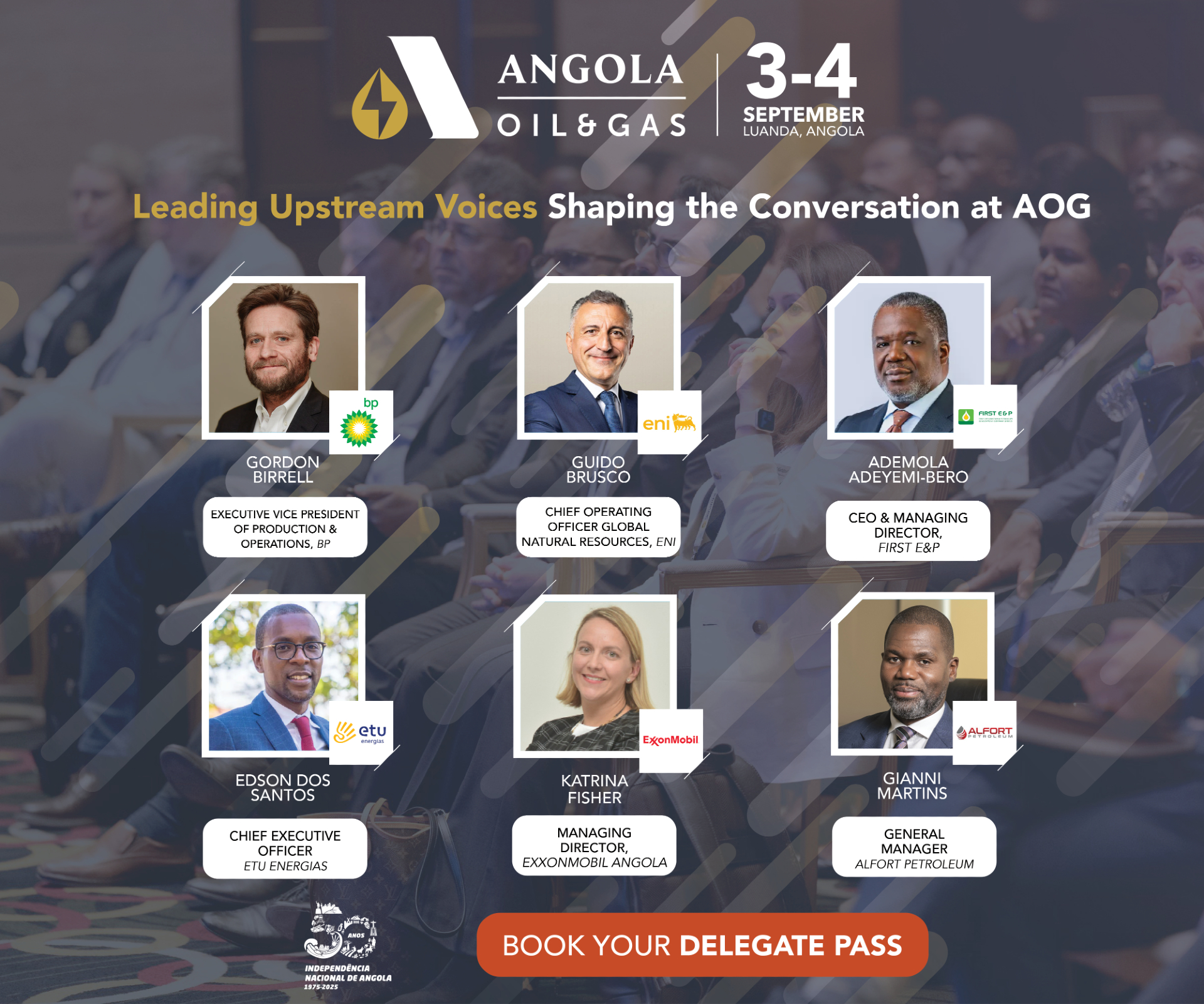With a long history in Angola, energy majors bp and Eni have played an instrumental part in unlocking resources and generating economic opportunities for the country. The merger of the companies’ Angolan operations in 2022 saw the rise of Azule Energy – Angola’s largest independent equity producer of oil and gas – and the subsequent integration of bp and Eni’s project portfolio and expertise. On the back of this, Azule Energy has spearheaded various large-scale operations in Angola, with new targets to increase production to 250,000 bpd. Major upcoming developments include the Agogo Integrated West Hub Development (2025) and Angola’s first non-associated gas project (2026). During AOG 2025, Guido Brusco, COO: Global Natural Resources at Eni, and Gordon Birrell, Executive Vice President of Production & Operations at bp, will provide insight into Angola’s exploration and production landscape, from oil exploration to natural gas to global partnerships and future investment prospects.