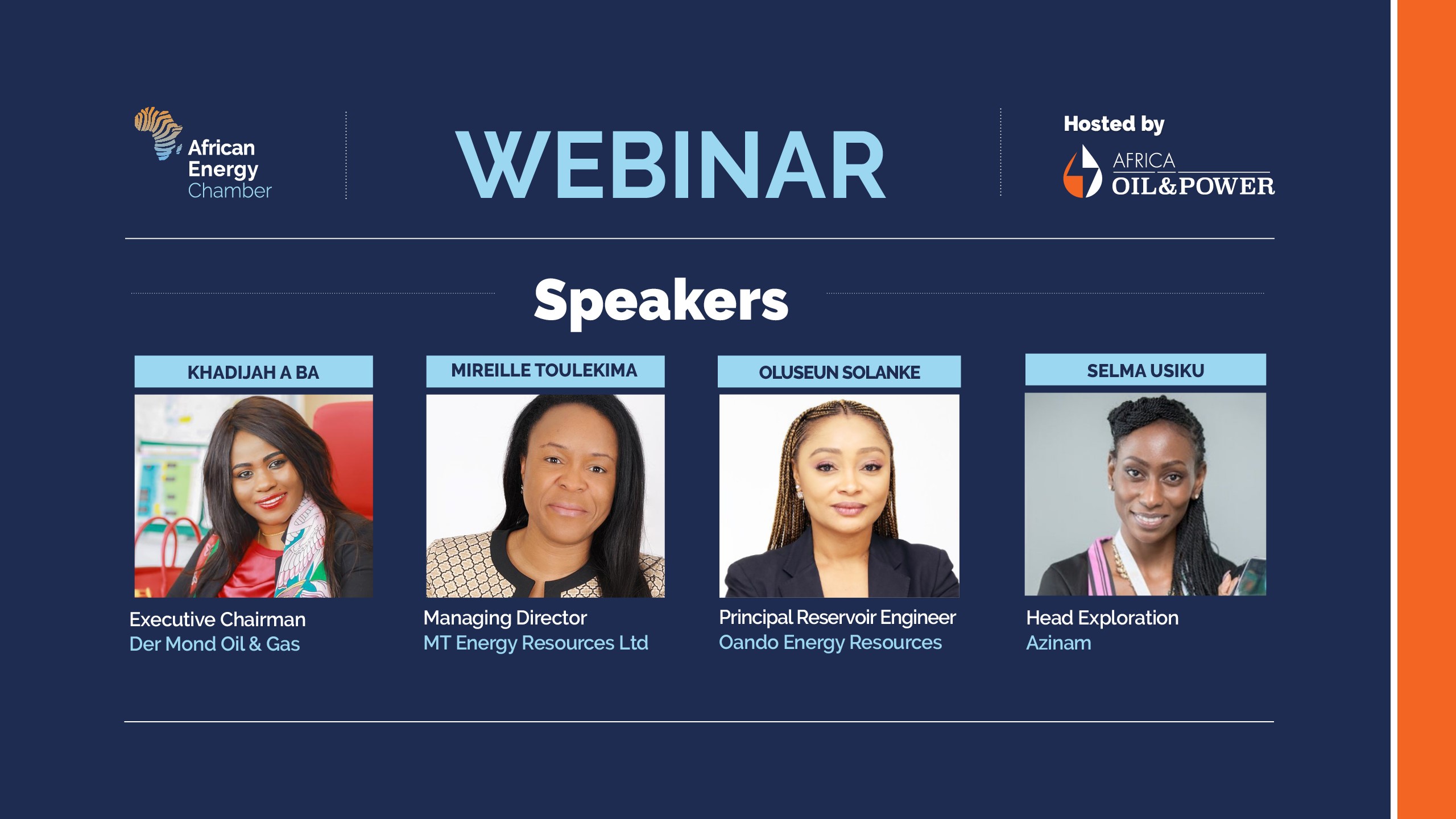 The webinar panel comprised Selma Usiku, Head Exploration, Azinam; Khadijah A Ba, Executive Chairman, Der Mond Oil & Gas; Oluseun Solanke, Principal Reservoir Engineer, Oando Energy Resources; and Mirelle Toulekima, Managing Director, MT Energy Resources.